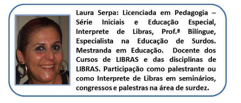 Se você tem interesse em estar aprendendo libras e de conhecer um pouco sobre a cultura dos surdo, te convido para algumas leituras e a conhecer a página e trabalho da interprete de libras Laura Serpa. (Link da página). Neste espaço você terá acesso a atividades adaptadas ou reelaboradas para Educação de Surdos, vídeos de palestras, materiais para baixar, experiências vivenciadas entre outros conteúdos.